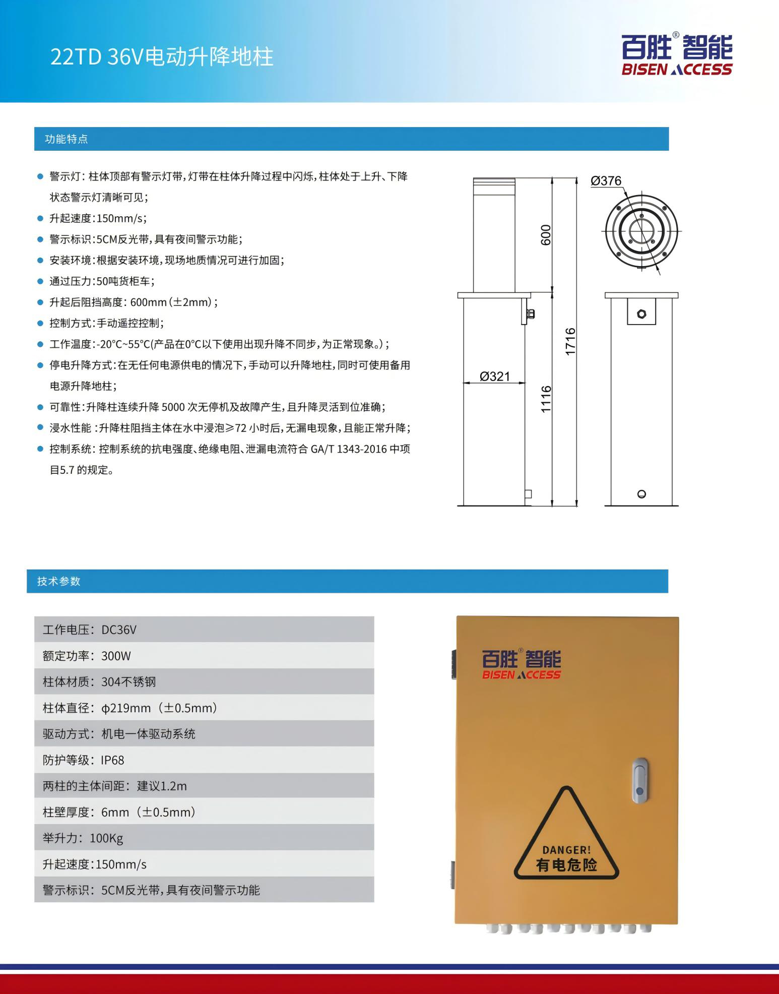 警示燈: 柱體頂部(bù)有警示燈帶,燈帶在柱體升降過程中閃爍(shuò),柱體處於上升、下降