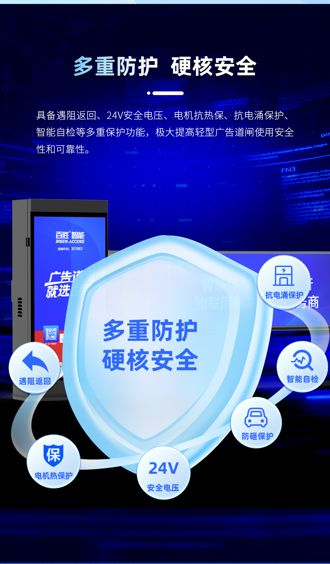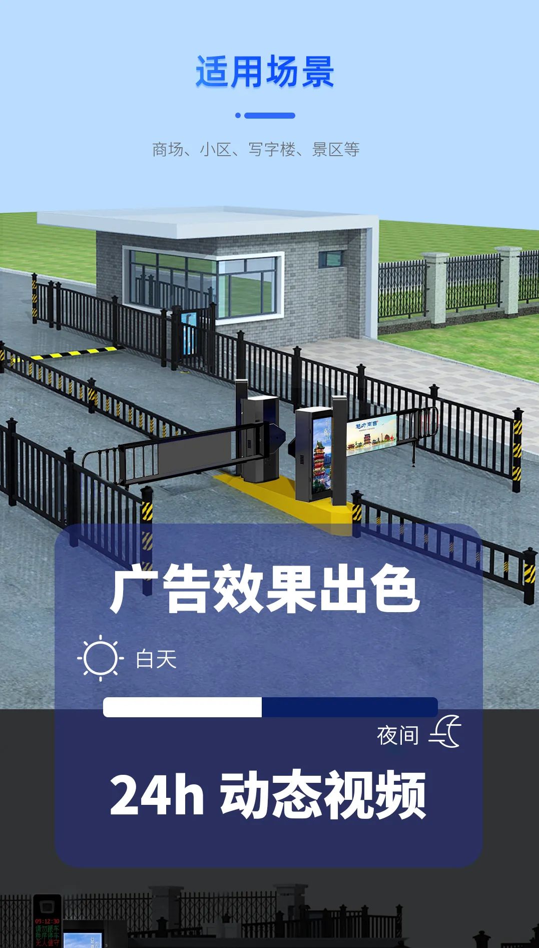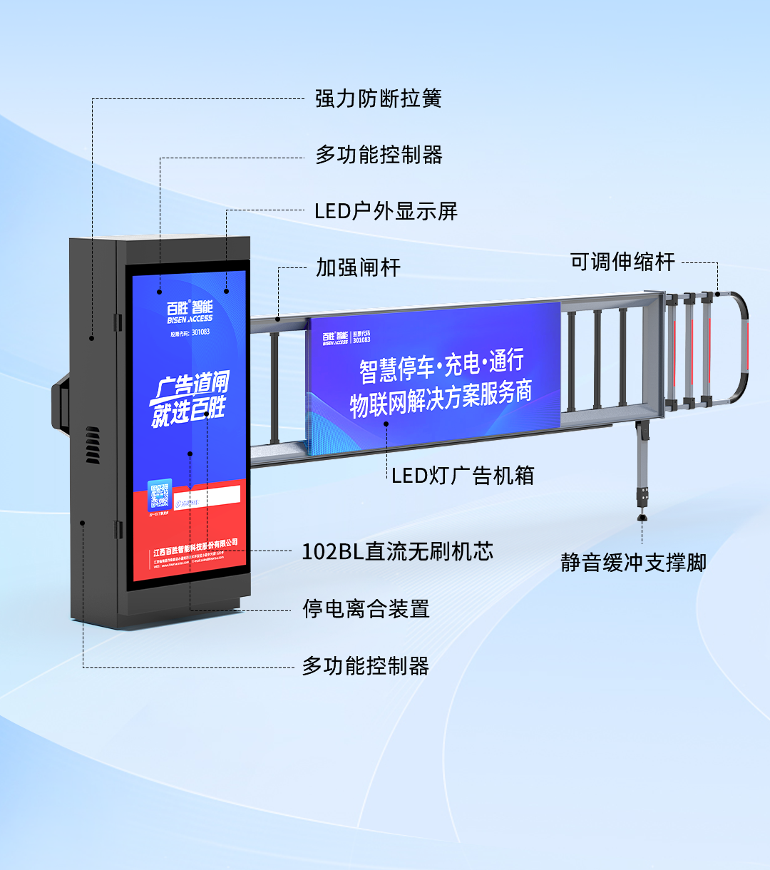 具備(bèi)遇阻返回、24V安全電壓(yā)、電機抗熱保、抗電湧保(bǎo)護智能自檢等多重保護功能,極大提高(gāo)輕型廣告道閘使用安全性和可(kě)靠性。