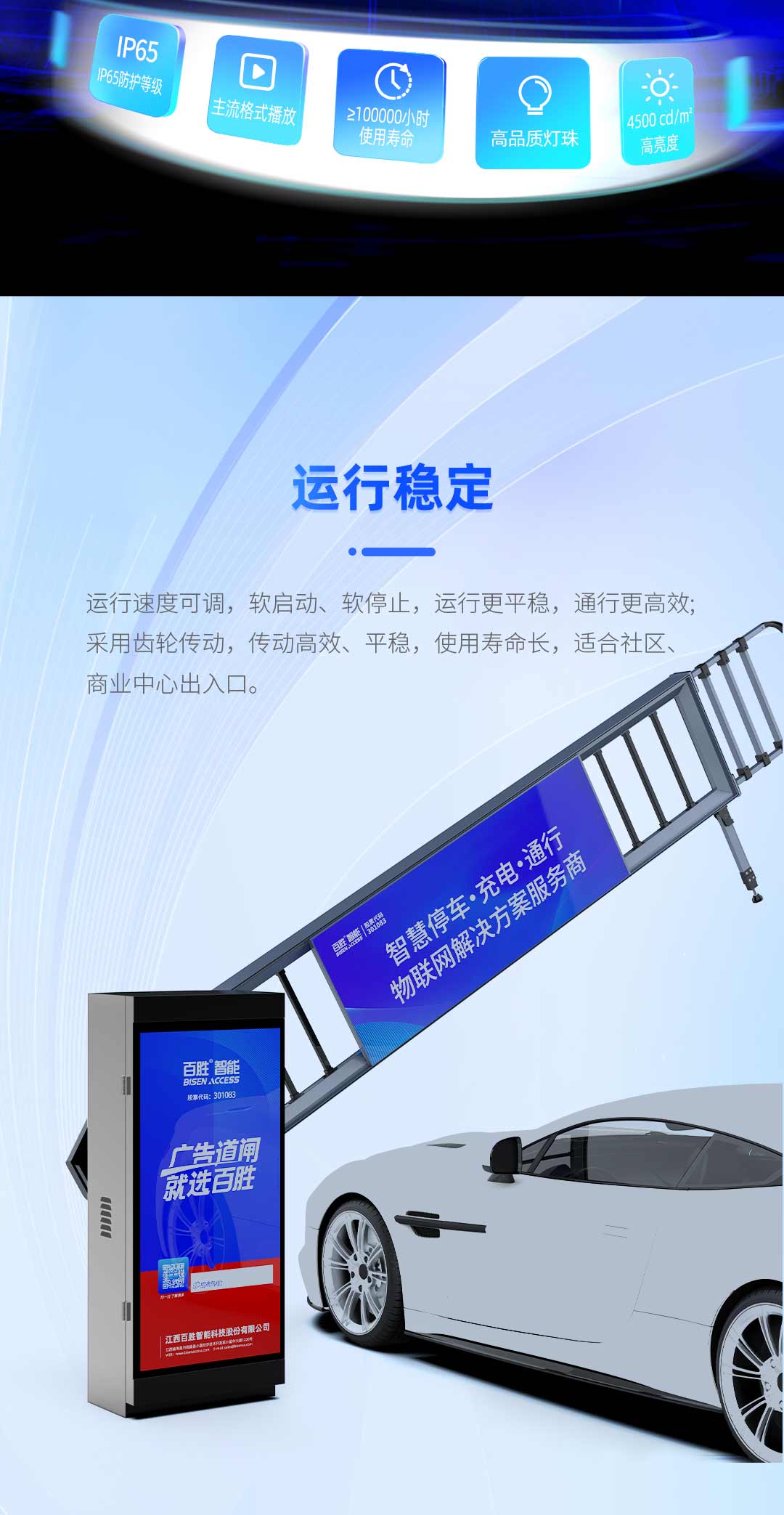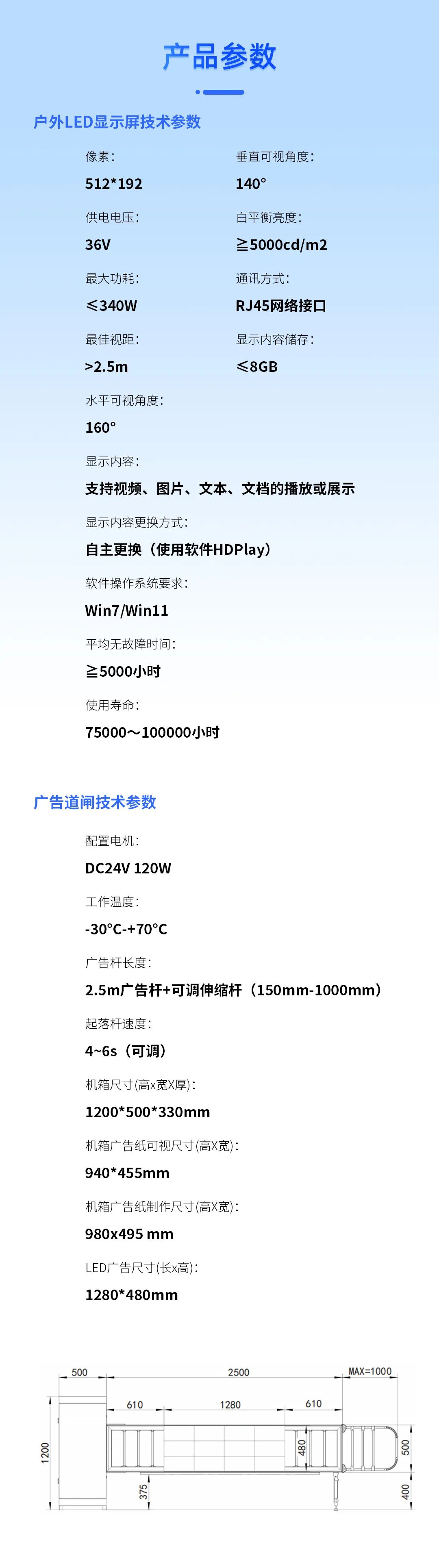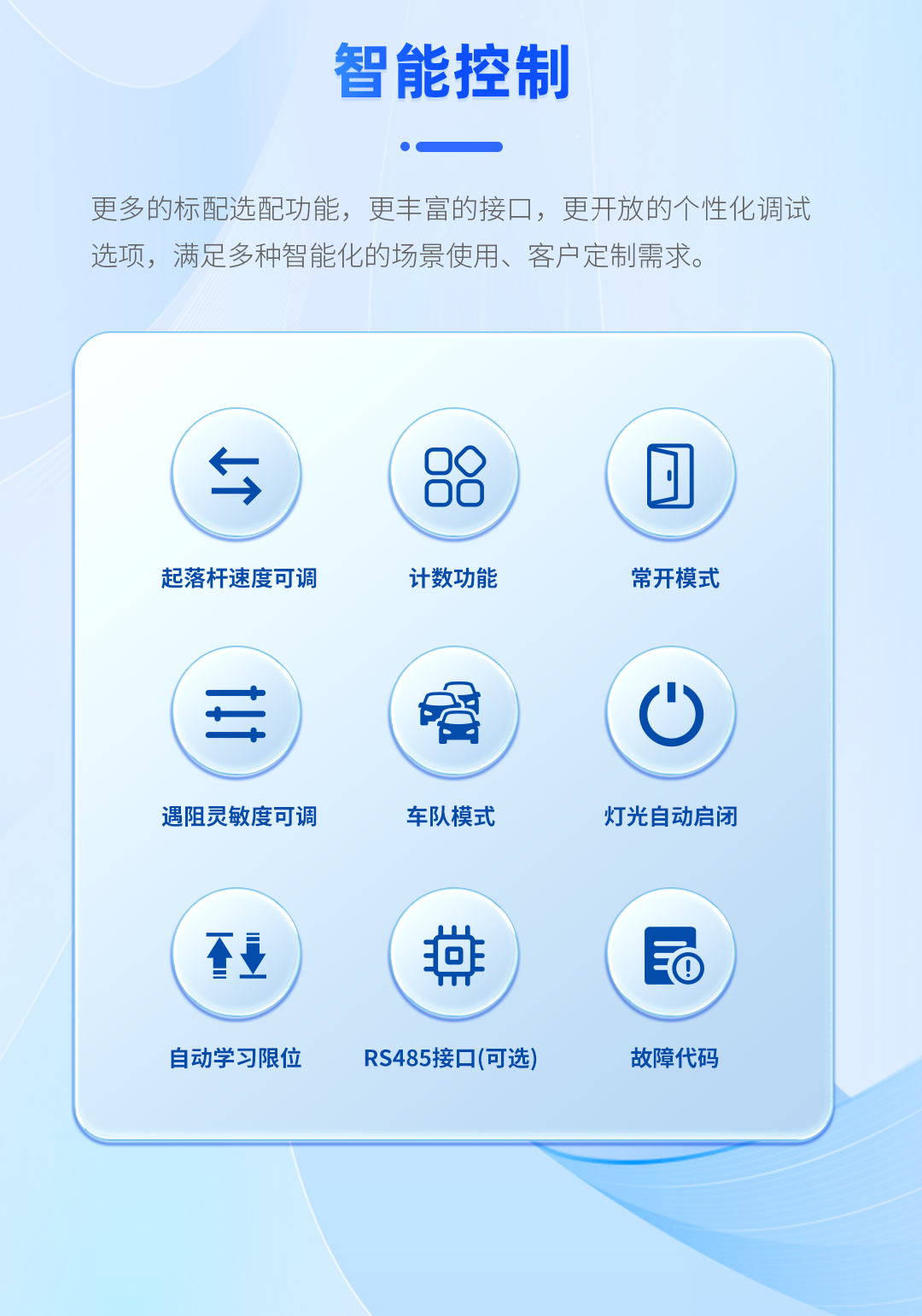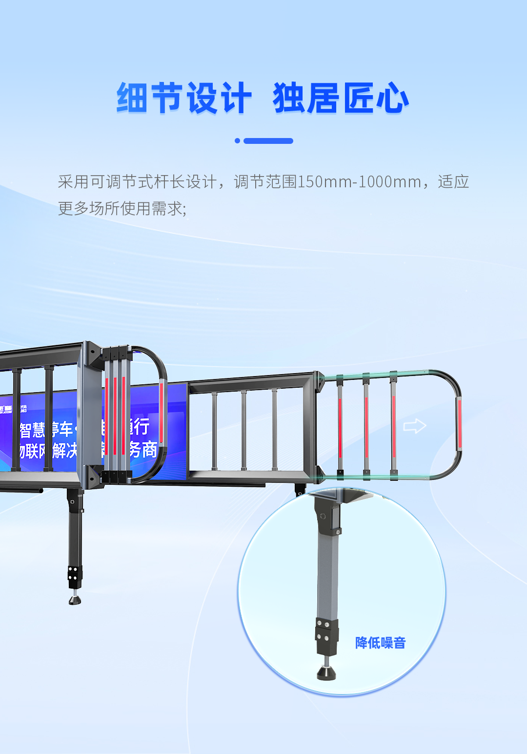 具備(bèi)遇阻返回、24V安全電壓(yā)、電機抗熱保、抗電湧保(bǎo)護智能自檢等多重保護功能,極大提高(gāo)輕型廣告道閘使用安全性和可(kě)靠性。