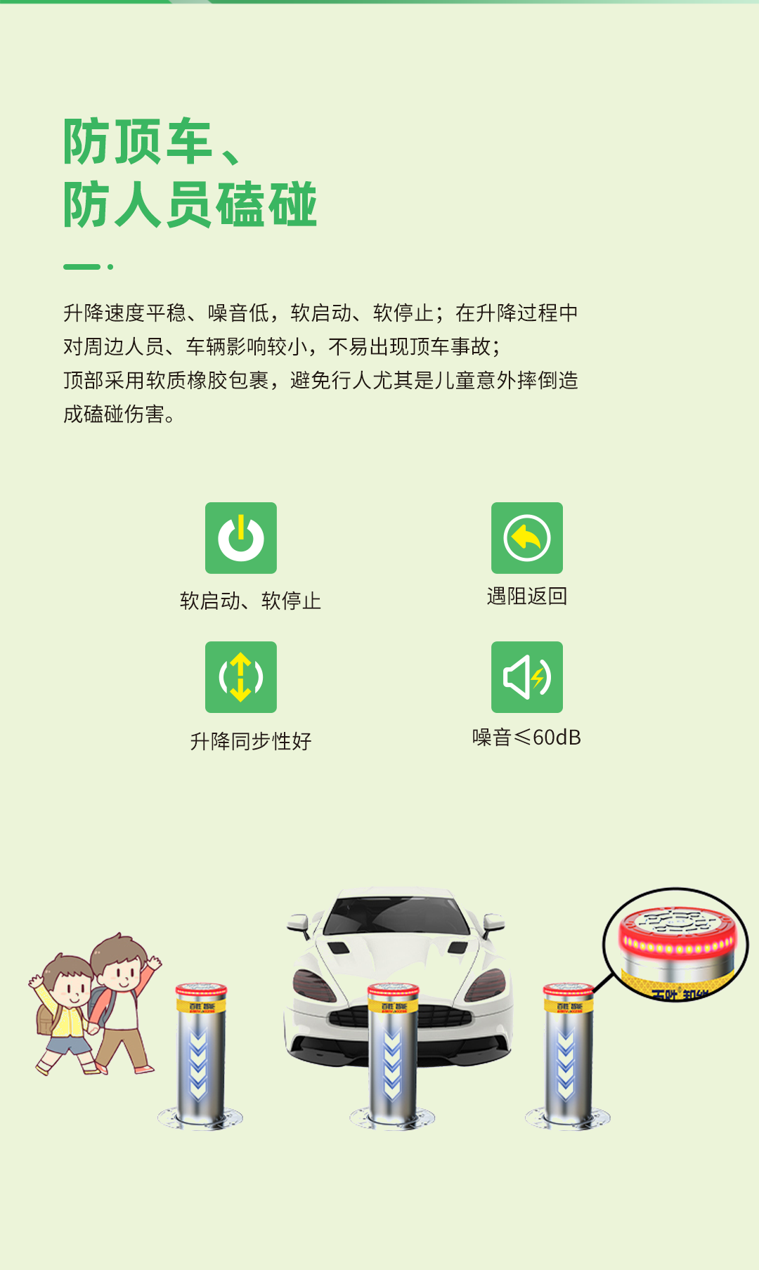 升降速度平穩、噪音(yīn)低(dī),軟(ruǎn)啟(qǐ)動、軟停止;在升降過(guò)程中對周邊人員、車輛影響較小(xiǎo),不易出現頂車事故;頂部采用軟質橡膠包裹,避免行人尤(yóu)其是兒童意外摔倒造成磕碰傷害(hài)。